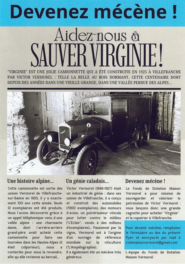 « Virginie » sera exposée à la Maison Vermorel et pourra être utilisée lors de défilés et autres manifestations mettant en valeur le patrimoine caladois du début du siècle. Elle pourrait aussi être utilisée comme véhicule publicitaire afin d’assurer, dans les rues de Villefranche et du Beaujolais, la promotion des activités de la Maison Vermorel.